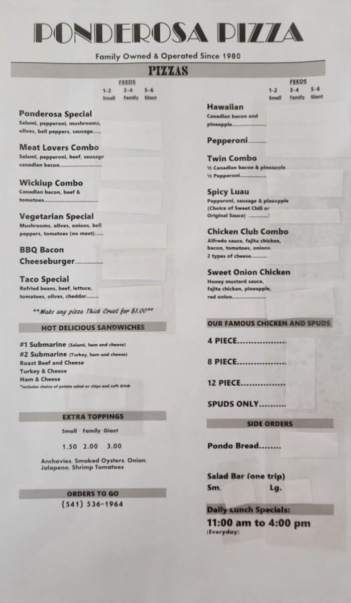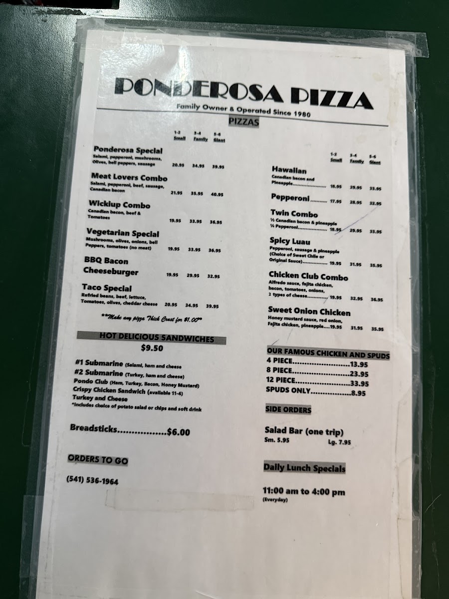 Ponderosa Pizza Parlor Menu